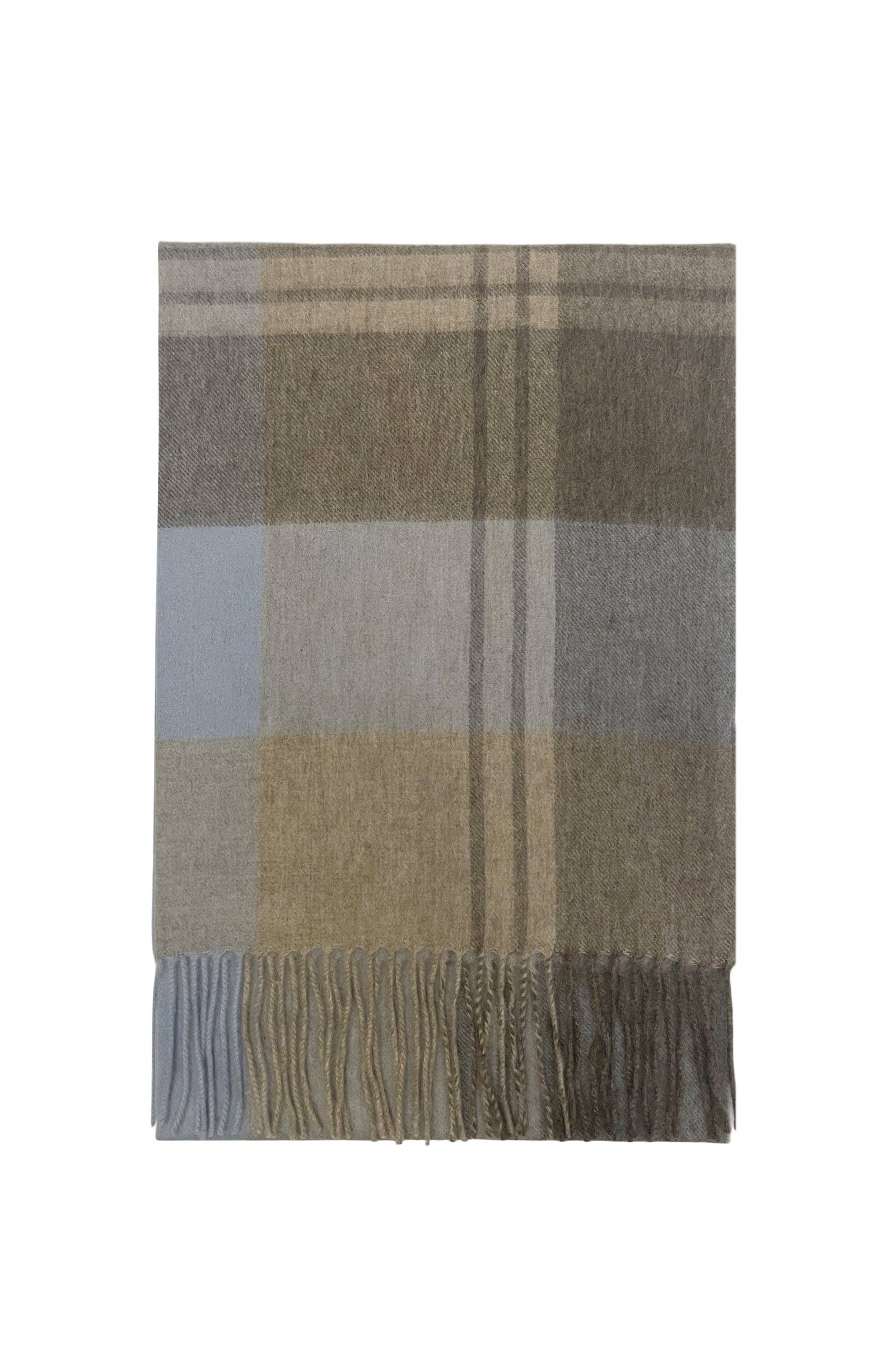 Large Check Wool Tassel Scarf: Sky Blue / Coffee